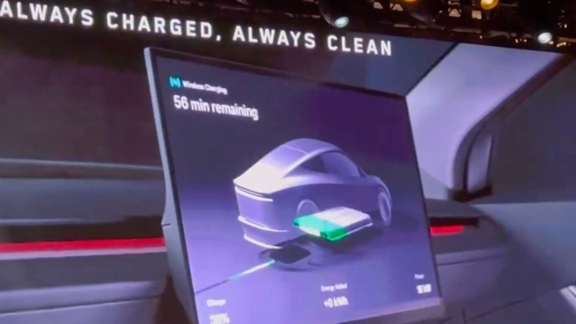 Auf den gezeigten Folien präsentierte Tesla das tatsächliche kabellose Ladegerät. Es handelt sich um ein großes Quadrat mit einem Kabel auf der Rückseite. Das Design ist minimalistisch und funktional gehalten, was eine einfache Reinigung und die korrekte Ausrichtung für Ladevorgänge erleichtert.